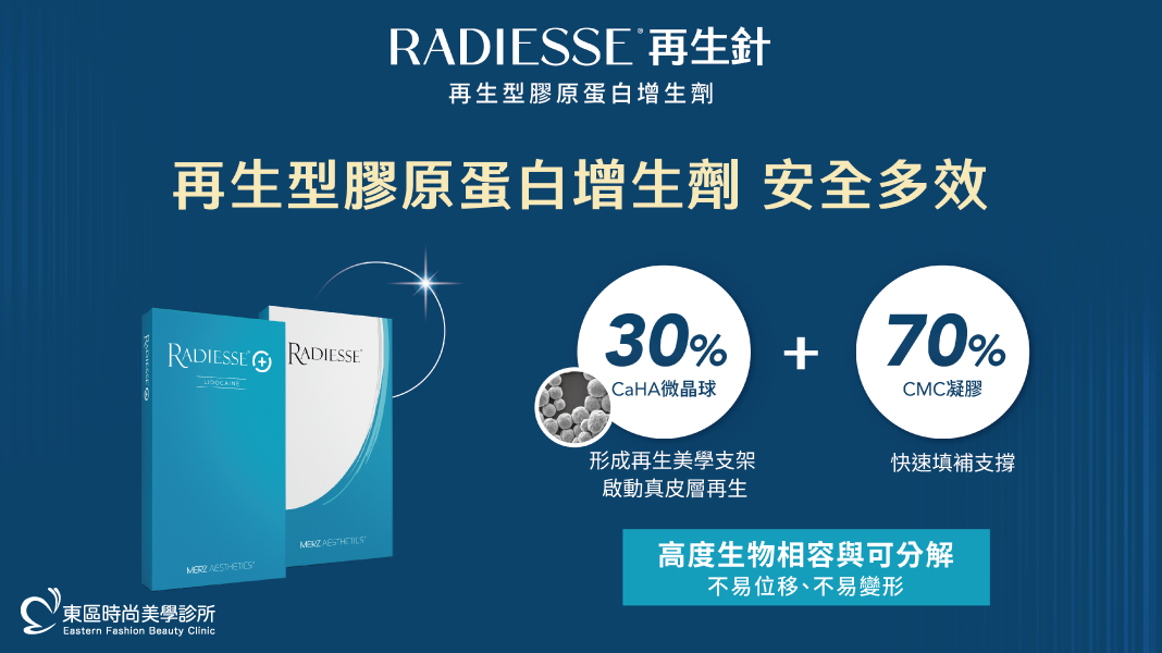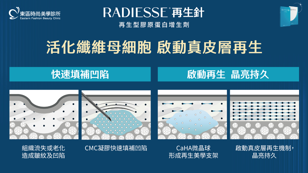 由30% CaHA微晶球和70% CMC凝膠組成的再生針已被國際期刊證實是【再生型膠原蛋白增生劑】,尊重皮膚學理,從源頭起動皮膚再生機制,實踐真正的再生美學。其主成份是大小一致、光滑圓潤的CaHA微晶球會形成再生美學支架,活化纖維母細胞,重啟真皮層再生,而CMC凝膠快速填補凹陷,可支撐、可拉提、可緊緻皮膚,實現自然的填充效果,長期更可調理膚質。