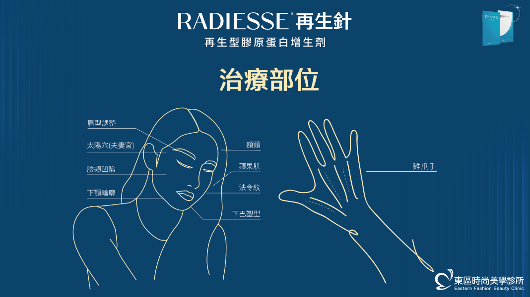 A:經由醫師評估後,再生針可用於矯正中度至重度的臉部皺紋、皺摺,亦可用於修復和矯正臉部脂肪萎縮 (如:額頭、太陽穴、夫妻宮、臉頰凹陷、法令紋、木偶紋、蘋果肌、下顎輪廓線、下巴塑型) 及 手部 (雞爪手)。